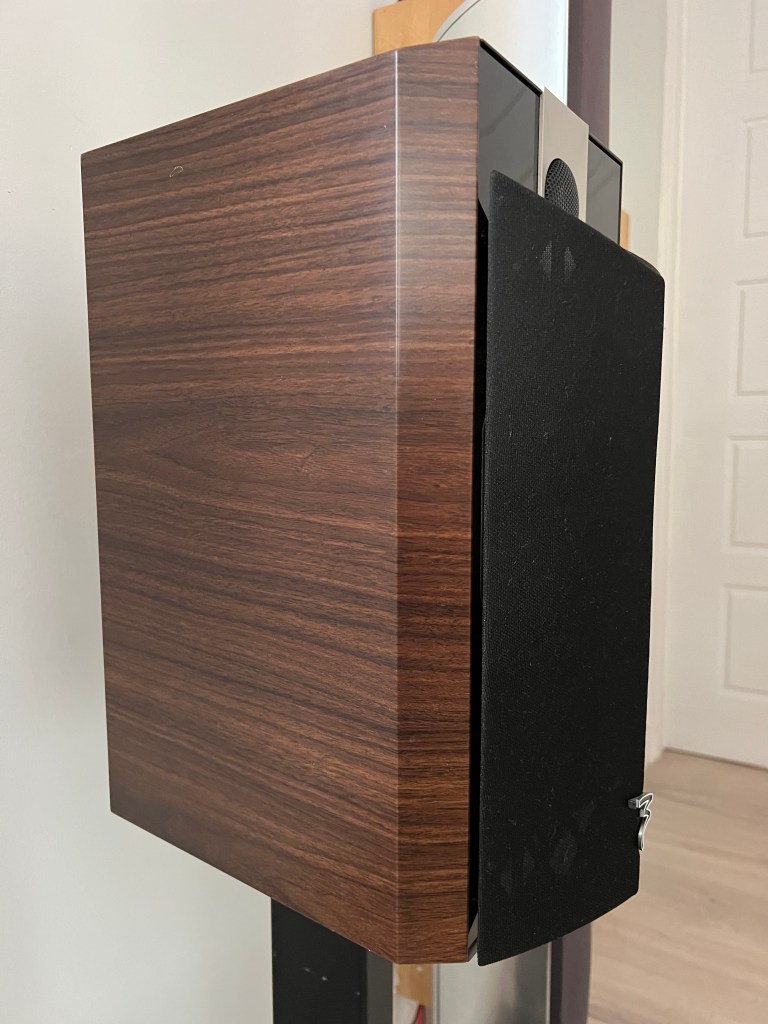 Très belle finition en bois (ou simili-bois?), vraiment un produit haut de gamme au joli design. Petit-moyen bookshelf d’environ 19 litres de volume externe chacun.